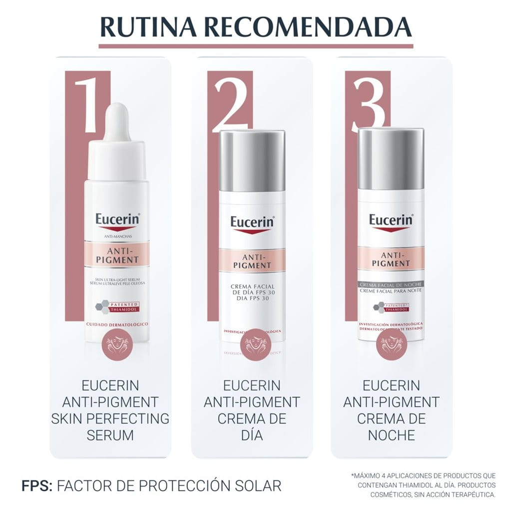 Eucerin Anti-Pigment Skin Perfecting Serum puede usarse solo o como parte de cualquier rutina de cuidado de la piel. Te recomendamos que uses Eucerin Anti-Pigment Skin Perfecting Serum dos veces al día, por la mañana y por la noche.